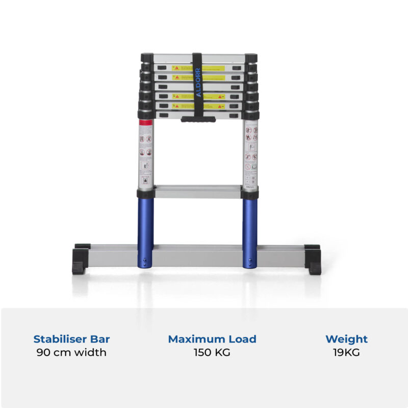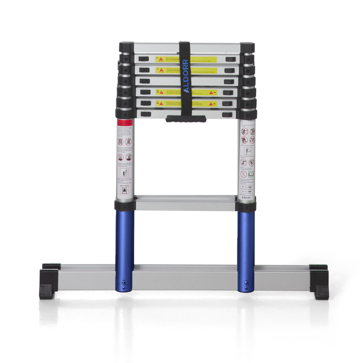The ALDORR Telescopic Folding Ladder is a robust ladder made of high-quality aluminium. It can be used as a free-standing ladder in the A-position, and thanks to the wide 90 cm stabiliser bar, you always stand firm and safe.