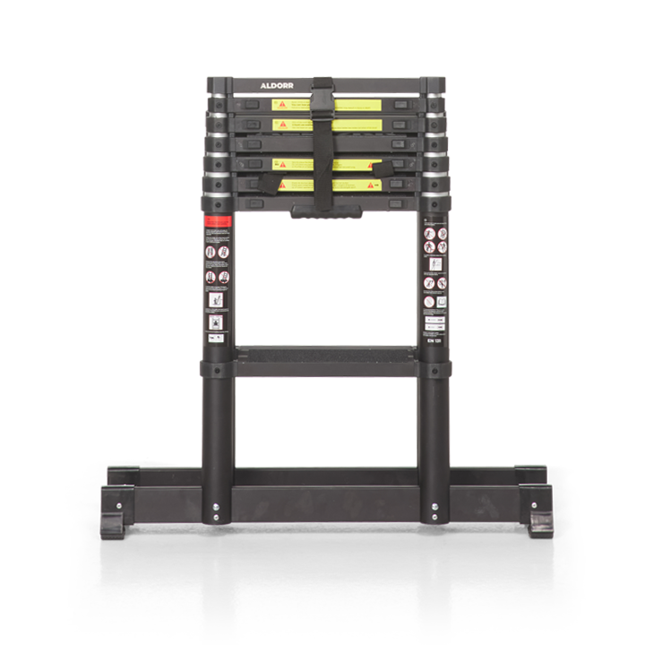 The ALDORR Professional Telescopic Folding Ladder The ALDORR Professional telescopic folding ladder is a robust ladder made from anodised aluminium with a durable black protective coating. It consists of 2 sections with 6 rungs each. The ladder can be used as a free-standing A-frame ladder. The wide 90 cm stabiliser bar provides extra grip and comfort during use. The telescopic folding ladder features a safe Soft-Close mechanism. This ensures the rungs slide down slowly and in a controlled manner, preventing your fingers from getting trapped. In addition, the ladder is equipped with indicators showing whether each rung is fully locked…