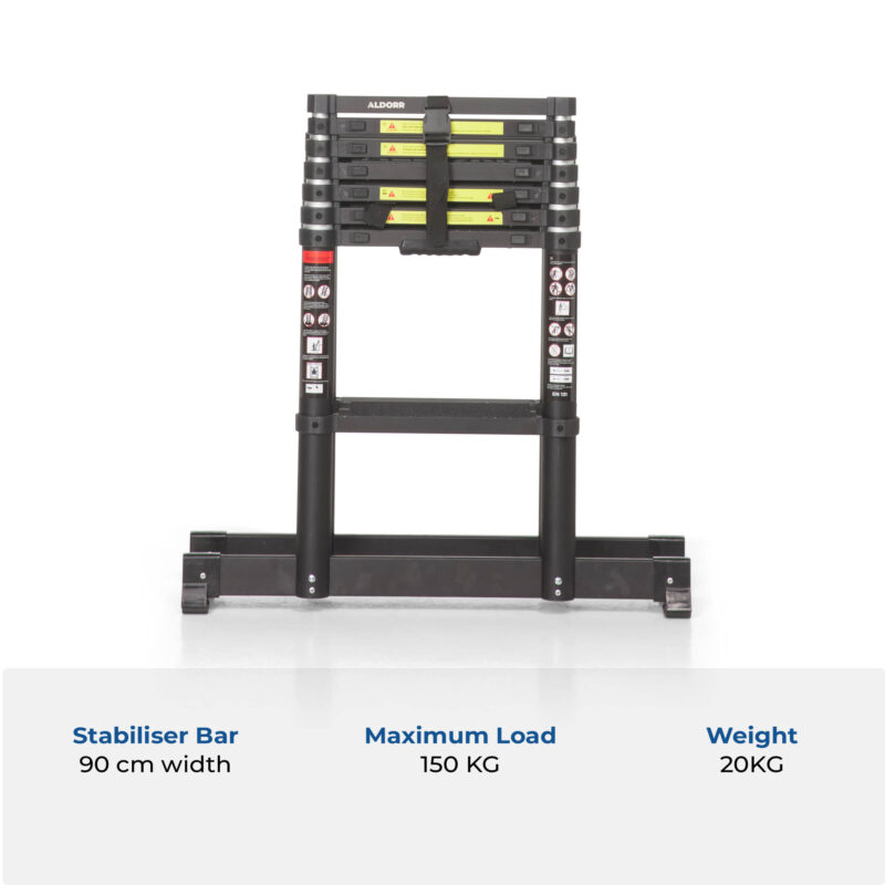 The ALDORR Professional Telescopic Folding Ladder The ALDORR Professional telescopic folding ladder is a robust ladder made from anodised aluminium with a durable black protective coating. It consists of 2 sections with 6 rungs each. The ladder can be used as a free-standing A-frame ladder. The wide 90 cm stabiliser bar provides extra grip and comfort during use. The telescopic folding ladder features a safe Soft-Close mechanism. This ensures the rungs slide down slowly and in a controlled manner, preventing your fingers from getting trapped. In addition, the ladder is equipped with indicators showing whether each rung is fully locked…