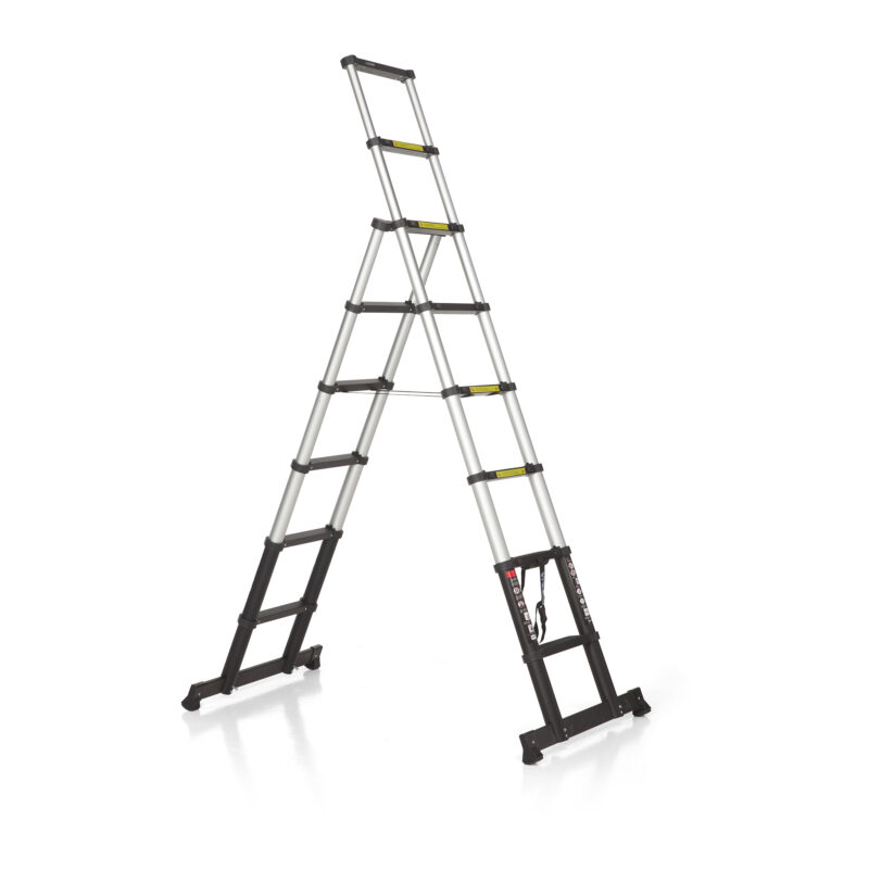 The ALDORR Professional telescopic folding ladder is a robust ladder made from anodised aluminium with a durable black protective coating. It consists of 2 sections with 6 rungs each. The ladder can be used as a free-standing A-frame ladder. The wide 90 cm stabiliser bar provides extra grip and comfort during use.